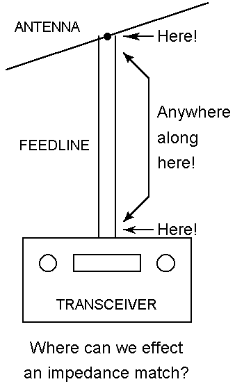 Where to effect a match: Against the background of these system elements we can pose our basic question. If the impedance at the antenna feedpoint does not match the characteristic impedance of a transmission line, where can we effect a match? The answer is simple: anywhere between the antenna terminals and the transceiver terminals (output/input connector).