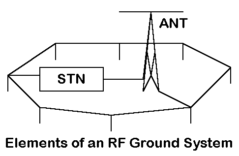 G4. RF ground: Effective RF ground also requires attention to many details. Deep rods, while useful, may be less effective as RF grounds than we previously thought, and the U.S. Army developed a system of perimeter straps and a sequence of shorter rods to effect a satisfactory overall station RF ground, as sketched (with many missing elements) above. RF paths to and from ground via transmission lines, circuitry-to-case connections, common mode paths, and numerous other sources are receiving increased attention both by those who build equipment and by those who assemble operating stations.