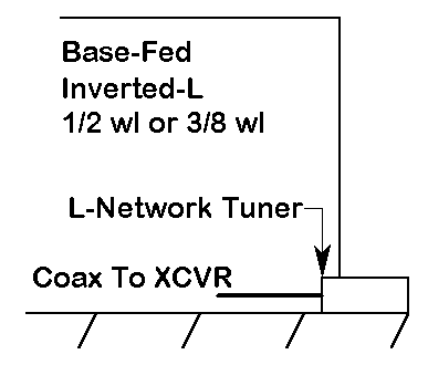 Let's take a closer look at another kind of example. In the past two episodes, we examined 1/2 WL and 3/8 WL inverted-L antennas. The base-fed design, with the associated L-network tuner, is most interesting to us here.