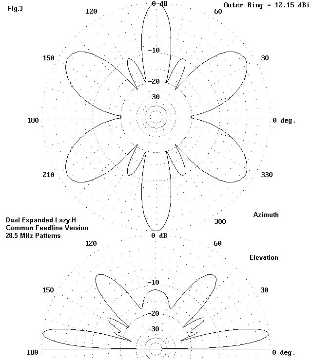 Fig. 3 shows the 10-meter azimuth and elevation patterns for the dual Lazy-H with a combined feeding and phasing line. The narrow lobes broadside to the wire would make aiming very difficult. As well, the antenna wastes considerable power at high elevation angles, where it does not do much to aid communications. In short, our tempting simple feed system has ended up defeating our ultimate goal of having broadside radiation throughout the HF range.