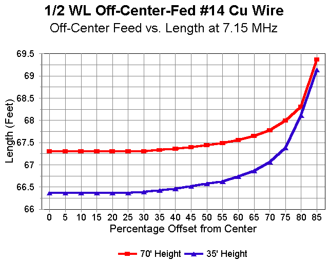 The first graph shows the length of two 40-meter OCFs, one at 35' and the other at 70' (1/4 and 1/2 wavelength up, respectively). The percentages are the ratio of D3 to 1/2L, in other words, the percentage of the distance outward from the center for the feedpoint. Not only are the lengths of the two antennas different, but as well, the resonant length of the antenna grows longer as the feedpoint is moved outward, especially after the 25% to 30% mark. In no case does the antenna correspond to the overall length given in equation (1).