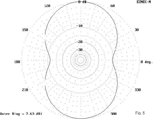 If we first assume that all radiation occurs in the antenna element and none in the feedline, then we discover that the gain of an OCF for the same frequency at the same height is 7.6 dBi with a take-off angle of 27 degrees. Figure 5 shows the azimuth pattern.
