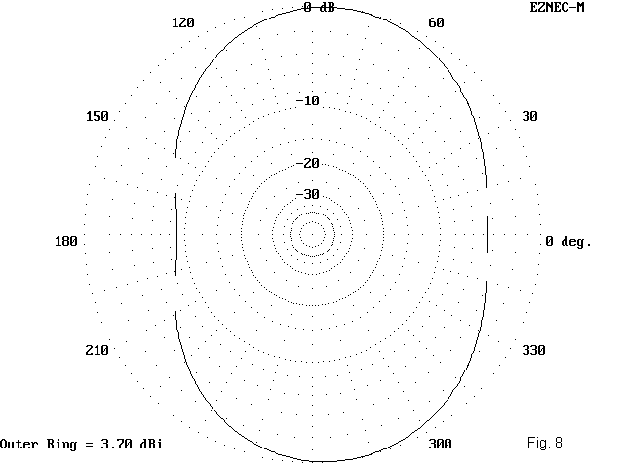 Figure 8 shows what happens if we increase the radiating parallel feedline to a full half wavelength. The gain drops to about 3.7 dBi, with a take- off angle of 24 degrees. The pattern is a significant oval (instead of a peanut): it yields a somewhat stronger signal off the ends--but no more than for an inverted Vee of moderate slope at the same peak height.