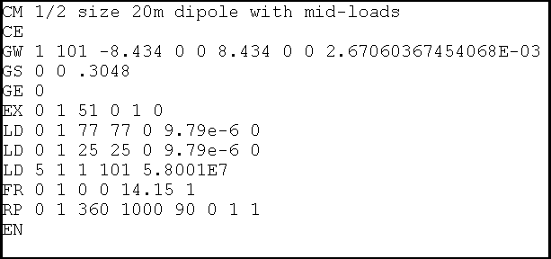 The following figure shows the antenna description in NEC input file format for the 20-meter dipole with the loads expressed in type 0 format: