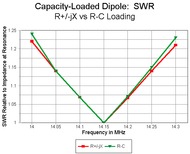 The SWR curves are hardly distinguishable, as one might expect from the table of source impedance values. However notice the steeper rise in reactance with the series R-L-C load, which provides the correct reactance of the loading capacitor for each frequency checked.
