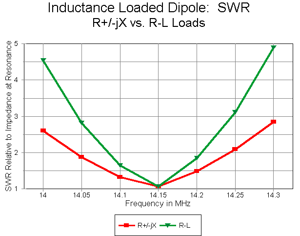 As the graph shows, assuming that the reactance of the coil will remain "close enough" to the value at the design frequency produces an overly optimistic curve of SWR. Using a series R-L-C load for which NEC provides the correct reactance at each frequency checked shows a much narrower (and more correct) operating bandwidth for the antenna. The difference is more than slight.