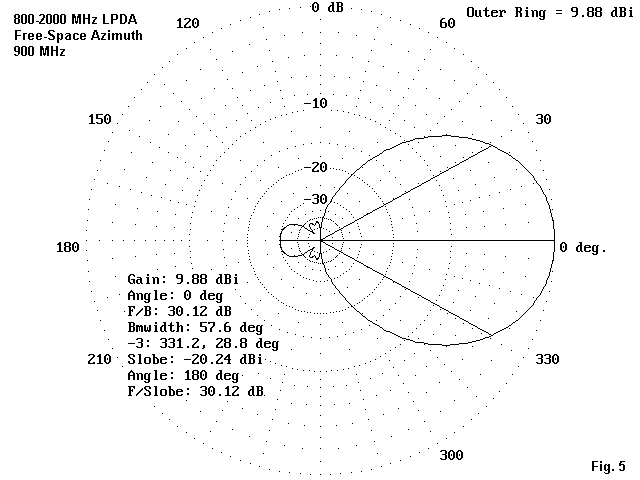 Fig. 5 shows a mid-range (900 MHz) free-space azimuth patterns for the single array. Although the basic numbers for gain and front-to-back ratio, as well as the overall shape of the pattern, appear to be excellent, the rear lobes show a small amount of excess lobing. The extra lobes are operationally insignificant by any standard, but should be noted.