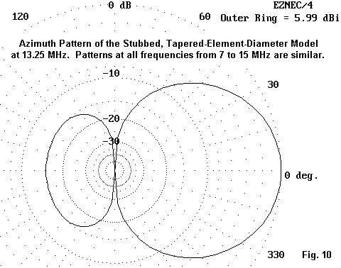 For the record, we might record what is now happening at 13.25 MHz, the frequency at which we examined the current distribution and magnitude on the elements of the 8904C LPDA array. As Fig. 9 shows, the addition of the 6" stub brings the rear 5 elements into relative quiescence so that the forward 5 elements take almost complete control of the antenna pattern. And while we are recording for the record, Fig. 10 shows the azimuth pattern of the stubbed array at 13.25 MHz. The pattern is perfectly ordinary for an array of this size and all of the patterns at all of the frequencies look almost identical. That is why we added the stub.