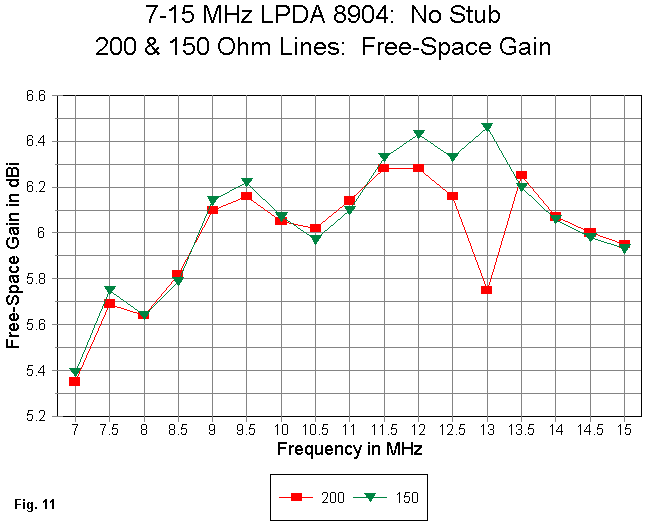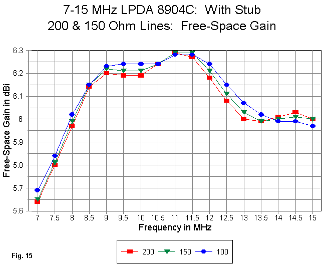 Another way in which designers improve the performance of standard LPDA designs is to reduce the inter-element phase line characteristic impedance. The recommended standard design value is 200 Ohms. This high value tends to reduce the erratic behavior occasioned by the harmonic operation of rearward elements, although in shorter-boom designs it does not always succeed--as we just saw with our stub exercise.