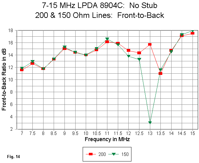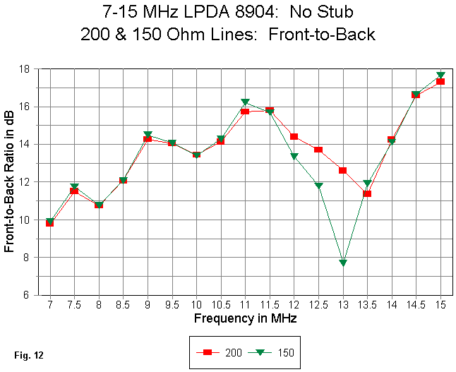 Before we cheer too loudly over the gain peaks in Fig. 11, we should examine Fig. 12, the graph of front-to-back ratios for the 200-Ohm and 150- Ohm versions of 8904. Although we can see some peak values for the 150-Ohm version marginally above those for the 200-Ohm version, we can hardly miss the deep depression in the front-to-back ratio from 12 to 14 MHz. Not only is the reduction of the ratio much deeper with our lower impedance line, it is also displaced to a lower frequency. The situation illustrates graphically the possibility in LPDA design of exacerbating undesirable conditions by lowering the phase line impedance.