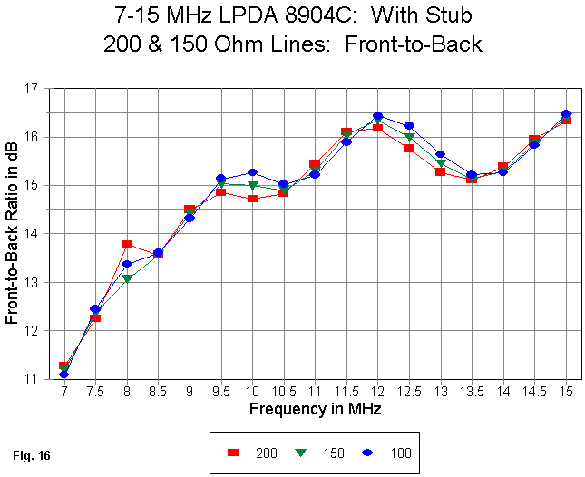 The front-to-back curves in Fig. 14 tend to replicate the results we obtained earlier. 13 MHz in this profile is a disaster of harmonic operation of the rearward elements. For the remainder of the curve, the lower impedance phase line does yield on average a slightly higher front-to- back ratio.
