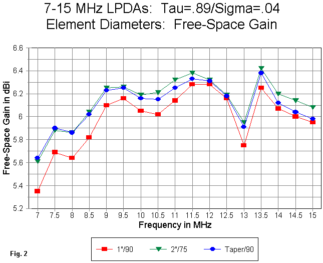 Fig. 2 shows the free-space gain in dBi of the three models with 1", 2", and tapered-diameter elements, respectively. Note that the curves generally track each other, coming together in the 12-12.5 MHz region of the passband. In general, the fatter elements add between 0.25 and 0.5 dB gain to the array. Except for the top two MHz of the passband, the tapered-element design general tracks the constant 2" design in gain performance.
