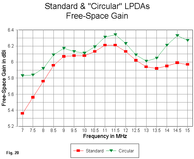 Fig. 18 shows us what we gained in the battle for gain: only a little. The extended LPDA improves the low-end gain by under 0.2 dB. There are higher gain peaks along the curve, especially in the 12.5 to 14 MHz region, but the gain is actually lower than that of the original model at the upper passband limit.