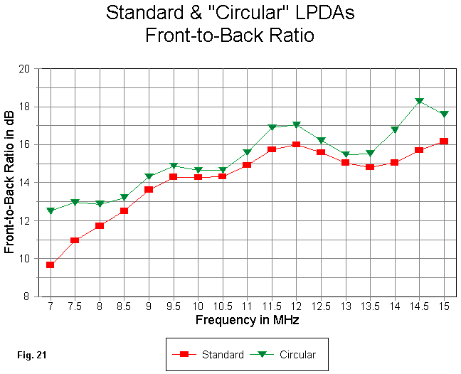 The improved front-to-back curve, shown in Fig. 21, would also be a marginal improvement were it not for passband edge improvements. At 7 MHz, the improvement is nearly 3 dB, an amount that approaches operational notice. Unlike the extended range LPDA design, these improvements add nothing to the length of the array, the number of elements, or the weight. Hence, pursuit of this strategy--perhaps in conjunction with larger element diameters, stub refinements, and a lower inter-element phaseline characteristic impedance to obtain a direct 50-Ohm match across the passband--might be a useful exercise for anyone wishing to perfect old 8904.