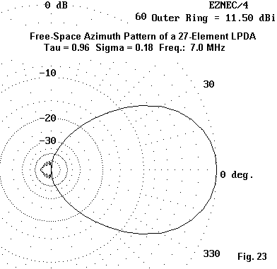 Fig. 23 confirms our suspicions. More dramatic than the 11.5 dBi free- space gain of the array is the truly insignificant radiation to the rear. It should be no mystery why many commercial and government shortwave stations have gone to sizable LPDA arrays and given up many of the older wire arrays that once covered hillsides.