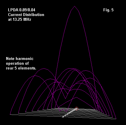 Fig. 5 shows the current distribution (and relative magnitudes) for the stubless tapered-diameter array at 13.25 MHz. Note that only the forward 5 elements show a single gain peak. The rear 5 elements all show the double hump of harmonic operation. (If the words were not so long, we could label the difference as that between dromedary and bactrian operation.) In LPDA operation, suppression of harmonic operation of elements is normally desired as a means to smooth the performance across the passband. So let's suppress it.