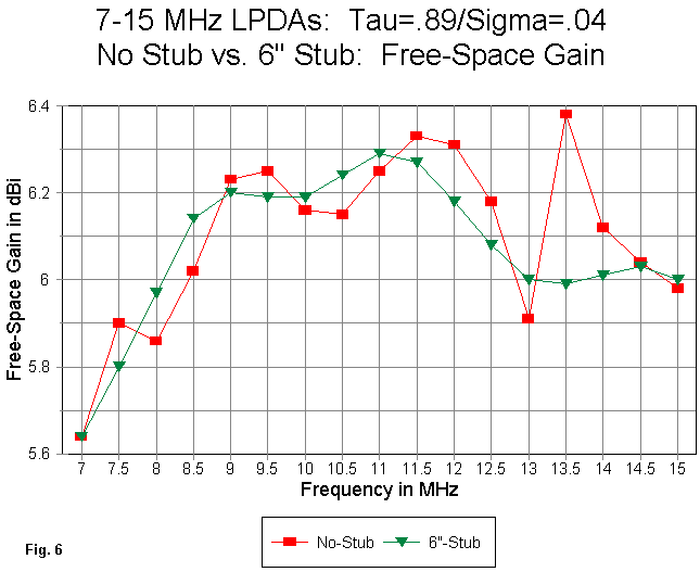 Many LPDA designs--for example, those intended for use on the amateur band only--do not care about having smooth performance curves across a given pass band. Instead, they wish to optimize performance within specific passband segments. Since we can control wayward performance in critical frequency regions with a stub, we can often obtain good ham band performance, but at the expense of performance outside those primary frequencies.