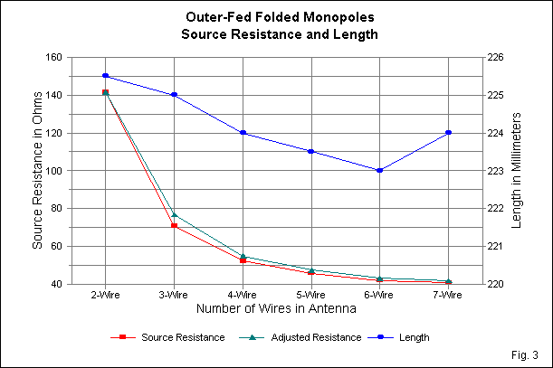 Fig. 3 shows two different facets of the series of folded monopoles from 2 to 7 wires total (1 to 6 fed outer wires). First, the required length of the monopole does not change more than about 1% over the sampled range. Second, the resonant source resistance values--both raw and adjusted--undergo an interesting progression downward as we add more fed outer wires. Moving from a 2-wire to a 3-wire model results in a 50% reduction in the feedpoint impedance. However, the impedance ratio for additional fed wires does not keep pace with the increase in the number of fed wires that gradually enclose the center return wire. We might innocently expect the 6-fed-wire model (7 total wires) to show 1/6 the impedance of the 2-wire folded monopole. However, the impedance is about 29% of the 2-wire model value at 41 Ohm reported and 41.9 Ohms corrected.