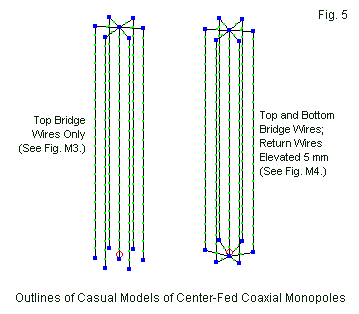 The outline of the structure appears on the left in Fig. 5. The figure also shows an alternative version of the structure. In order to ensure that the return wires electrically terminate at the end of the segment containing the source, I ended the vertical outer wires 5 mm above ground. From each "loose" end, I ran a 2-segment wire to the bottom of the center wire at the ground-plane level (Z=0). The right-hand outline in Fig. 5 should make the plan clear. The wire table in Fig. M-4 will confirm the wire structure.