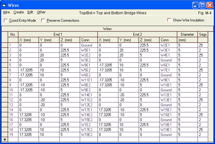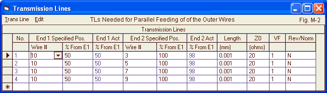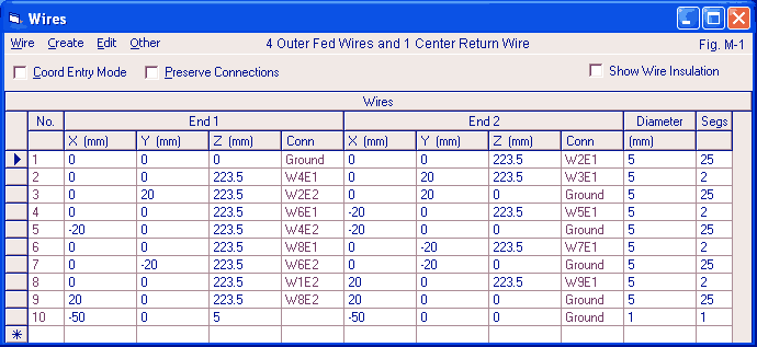 Fig. M-1 shows the EZNEC wire table for one of the models in the series. It uses 4 outer fed wires with a center return wire. The segmentation of the wires is clear, along with the equal spacing of the outer wires. At the bottom of the list is a very short (5-mm long) 1-mm diameter wire. Its function is to serve as the source wire.
