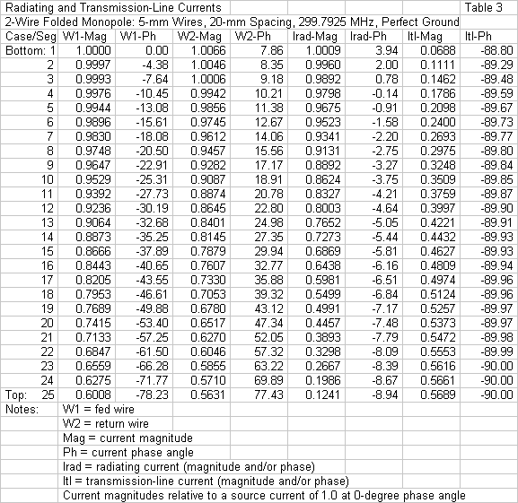 The situation suggests that the behavior of the assembly changes with respect at least to transmission-line currents as we more completely surround the return wire, that is, as we approach a coaxial situation. One way to view the difference quantitatively is to sort the radiating and the transmission-line currents from at least two examples. The first sample uses the 2-wire folded monopole, the current patterns for which should be reasonably familiar. Table 3 separates the radiating and transmission-line currents for all 25 segments of the 2-wire folded monopole.