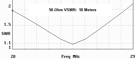 Performance on each band is quite normal. Fig. 2 shows the 50-Ohm VSWR curve for 15 meters, while Fig. 3 shows the 10-meter 50-Ohm VSWR curve. The slightly higher values of SWR across the band on 10 meters suggest that the 15-meter rectangle influences the 10-meter rectangle more than the other way around. As with monoband Moxon rectangles, forward gain varies from about 6.2 dBi at the low end of the band to about 5.7 dBi at the upper end in free space models. Relative to other 2-element designs, the front-to-back ratio is superior across the band.