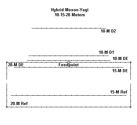 It is possible to replace the 20-meter elements with a Moxon rectangle and obtain tri-band performance on a 16' boom. Fig. 4 shows the general outline.