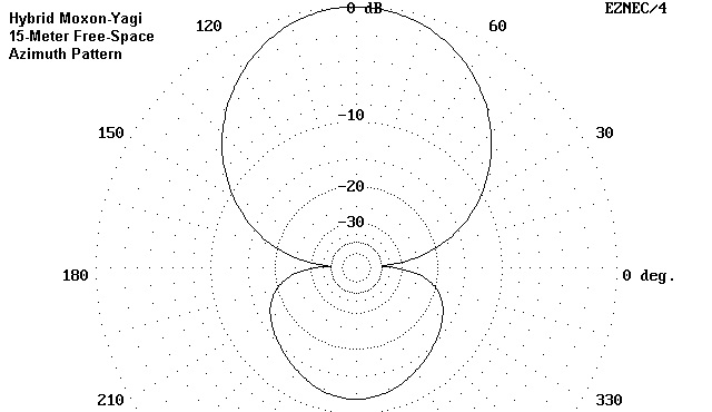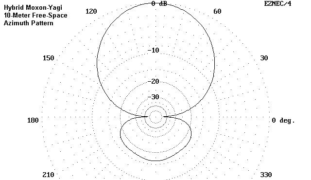 10-Meters: Fig. 9 shows a free-space azimuth pattern for the hybrid antenna at 28.5 MHz. Again, it is a typical 2-element Yagi pattern, with a slightly better front-to-back ratio due to the use of directors.