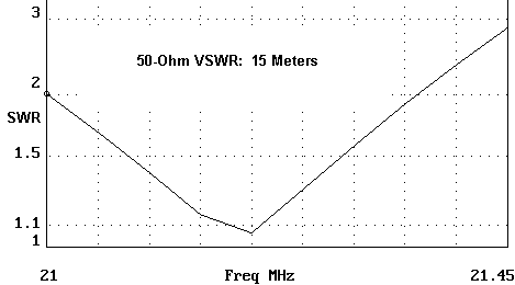 Note that the effective 2:1 SWR bandwidth is about 350 kHz or just a little bit more on 15 meters. One consequence of a simple open-sleeve coupling feed system is a more rapid rise in reactance as one moves away from resonance. At the upper end of the band, the reactance controls the SWR figure. One may, of course, reset the driver length to favor the upper end of the band. In addition, a broader operating bandwidth may exist at the ground end of a standard 50-Ohm coaxial cable--the exact width depending upon the line's length and losses.