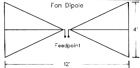 The terms "fan" and "bowtie" have a checkered history in amateur antenna lore. Some writers have treated any set of spread multiple dipoles as a fan antenna. The most common use of the term in this way is for 2 or 3 dipoles--with each end independent--cut for various portions of the 3.5 to 4 MHz band. This multiple antenna exhibits separate SWR minima for each dipole. The spread multiple dipole is not what we shall mean by a fan. To be a "true" fan (for our purposes), the structure must electrically connect the element members at the end. The "true" fan is a single virtual fat element that exhibits a single resonant point. Unlike the folded dipole, the wires of each side of the fanned element are also joined that the feedpoint.
