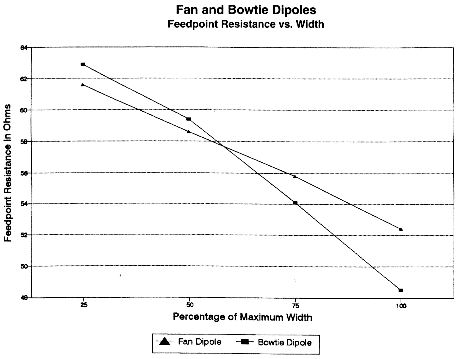 Moreover, almost any version of the spread single element (except for the multiwire cage) has been called either a fan or a bowtie, with no distinction between the two terms. Perhaps the use of the antenna in television reception occasioned the double reference, or perhaps it has been around since the antenna achieved some notice in the late 30s and 40s, evolving into the "Wonderbar" of the 50s. However, there are two distinct ways of widening an antenna element. The first way involves a linear fanning of two wires and bringing them back together vertically at the end (with or without a conductive center tube for support): this element we shall call the fan. The second way involves spreading the wires to a maximum separation somewhere along each half of the dipole--usually the midpoint--and bringing them back together angularly toward the end: for obvious visual reasons, we shall call this the bowtie. Fan and bowtie elements have similar, but not identical, properties.
