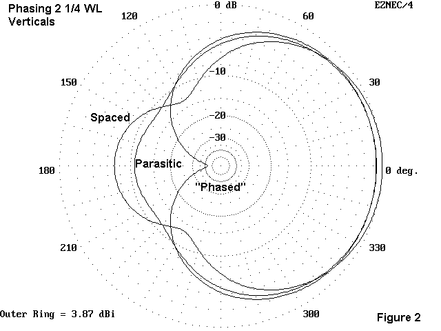 Let's look again at the difference between geometric and electronic control of the current on a second element, this time using 1/4 wavelength verticals. We shall set two of verticals exactly 1/4 wavelength apart. First, we shall make both antenna elements the same length and feed only one. That yields the "spaced" pattern in Figure 2. It is a nice pattern, but we can improve the front-to-back ratio. Next, we shall increase the rear (reflector) element length and shorten the driven element back to resonance so that the two elements have about a 4% length difference. The performance peaks out on the curve called "parasitic" in Figure 2. In short, altering geometry can do only so much to establish the conditions for maximum front-to-back ratio. (For many operating situations, the improvement in front-to-back ratio may be sufficient; for others, it will need improvement.)
