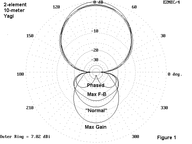The patterns also show other important things. First, the maximum gain set-up differs from the maximum front-to-back set-up. The "spaced" array of two identical elements with only one fed yields the most gain. Both attempts to improve front-to-back ratio show less gain. Second, we always have to evaluate whether the gain or the front-to-back ratio will do us the most good for our operating needs.