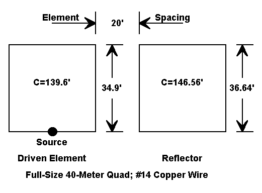 A full-size 2-element quad for 40 meters has the width of a half-size 40- meter Yagi--about the same width as a full-size 20-meter beam. However, the vertical space requirement and the consequential support structure is very significant. The quad forms a box about 36' top and side, with a front-to-back spacing of about 20 feet.