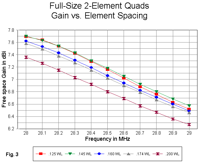 The collection patterns also reveals that there is a significant variation in the forward gain across the band--something over 1 dB between 28 and 29 MHz, with the lowest gain at the highest frequency. The decrease in gain with an increase in frequency is a characteristic typical of parasitic 2- element driver-reflector designs, whether Yagi or quad. Parasitic designs having a director typical show an increase in gain as the frequency increases.