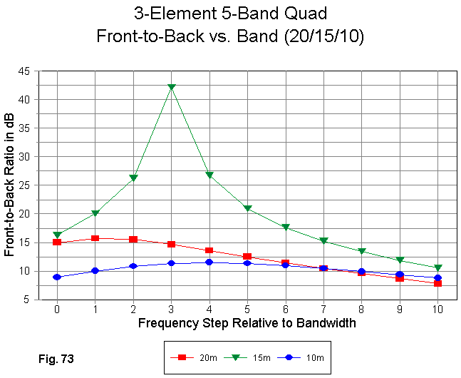 The front-to-back ratio curves in Fig. 69 tend to confirm that--if the model is reasonably accurate--inadequate attention has been paid to 10 meter dimensions. The front-to-back ratio on that band only rises above 10 dB at about 28.6 MHz and continues to climb toward the 29.0 MHz mark, where the scan ceased. In contrast, the front-to-back peaks for both 20 and 15 meters occur within the passband under study. In accord with the suggestion that the 20 meter loops are least affected by the other loops in the array--in other words, act most like a monoband array--the 20-meter front-to-back curves show a frequency displacement that is missing from the 15- and 10-meter curves.