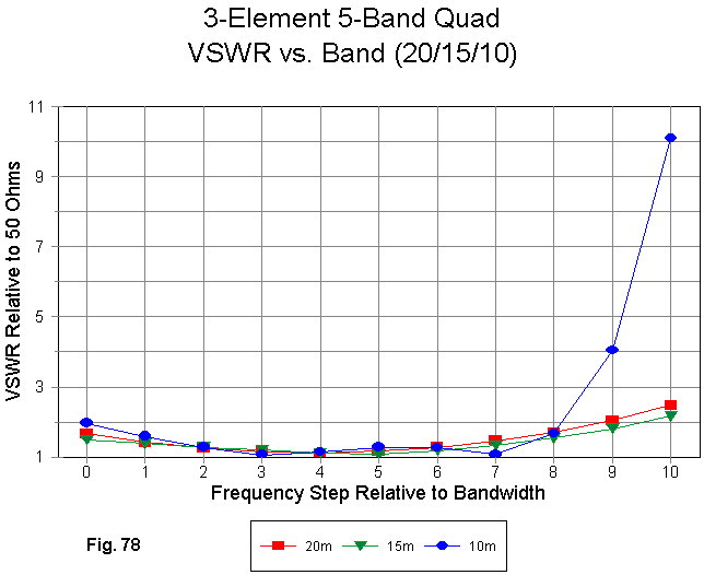 There may in fact be designs available that achieve all of this. My small sample of models can make no claim to being exhaustive or even representative. However, if those designs are not available at present, then multi-band quad designers have a fertile field of endeavor for some time to come. If someone is going to erect something of the mechanical complexity of a many-element, many-band quad, he deserves to have the optimal performance to be gained from the array--and from the investment he has made in it and in its supporting structure.