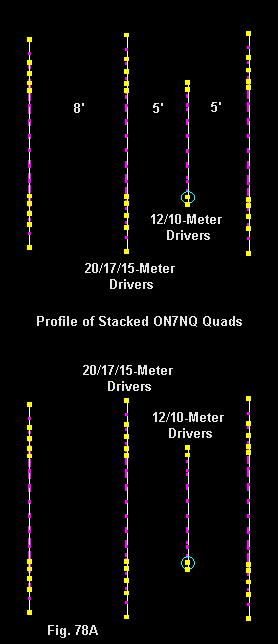 The ON7NQ array is planar in design, but has more gain than the 2-element planar designs examined so far. Hence, it was likely that the best stacking distance might be more than 24'. In fact, a 30' spacing produced adequate isolation (and convergence of the feedpoint impedances with the single array values). However, 36' proved to be a bit far apart, as the lower-band front-to-back ratio began to decreae--or shift off of the design frequency. Therefore, the following preliminary figures for the single array and the stack in free space use a 30' stack spacing, as measured from the hub of one array to the hub of the other. Fig. 78a shows a profile of the stack.