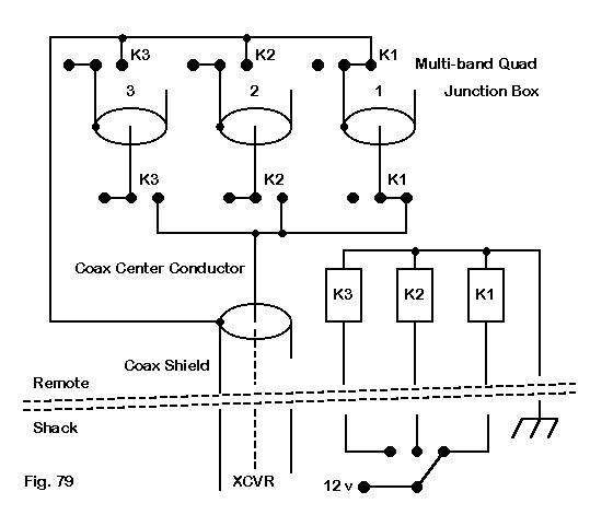 A multi-band quad may be fed through a couple of arrangements using a remote switching system. Perhaps the most common system is to run a section of feedline from each loop to a central remote switch and relay system. Fig. 79 illustrates such a system in simplified (3-band) form.