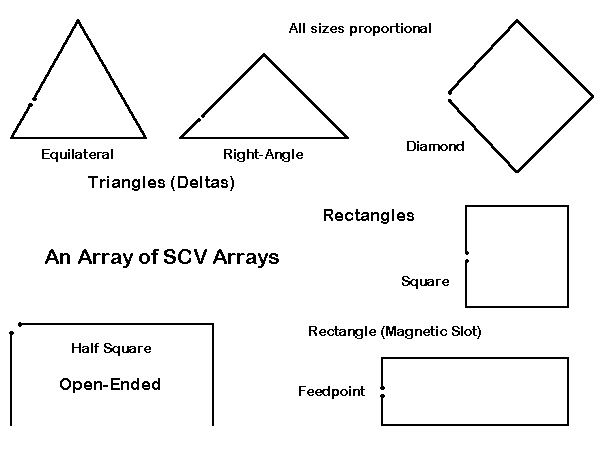 3. SCVs come in several varieties, all of which are related. The two most recognizable shapes are the triangle and the rectangle. Triangles (or "deltas") tend to vary from equilateral to right angle. Rectangles can be anything from squares (quad loops) to long flat rectangles, sometimes dubbed "magnetic slot" antennas.2 Quad loops can be either set up as squares or as diamonds.