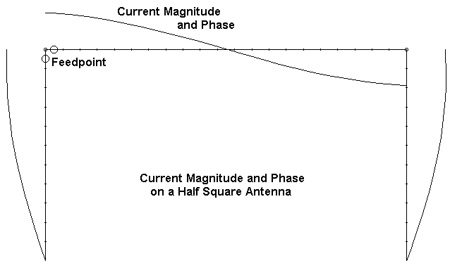 Figure 3. Current magnitude and phase on a half square antenna. For each type shown in Figure 2, the 1/2 wavelength phasing line extends from the feedpoint to a similar point on the opposite side of the antenna.