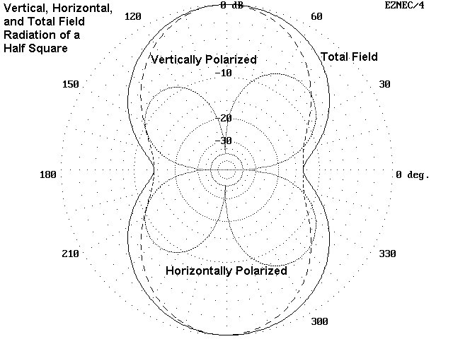 Figure 4. Vertically polarized, horizontally polarized, and total field radiation for a half square. Patterns of the other SCVs are similar.