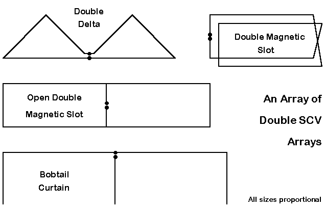 For additional bi-directional gain, SCVs can be placed side-by-side with a common feedpoint. The near-1/2 wavelength spacing of vertical members with the requisite phase reversals along the line(s) yields additive radiation broadside to the array. Hence, there have been open double rectangles, open double deltas, and the bobtail curtain.4 Figure 5 illustrates the shapes of these antennas, along with one other: the double magnetic slot--or double side-fed rectangle. This antenna provides feedpoint impedance transformation from a normally very low value to one more favored by hams.