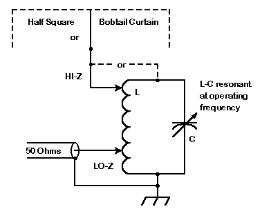 The final gain winner in the group is the bobtail curtain (BC). Fed about midway up the center vertical toward the horizontal wire, the impedance is about 70 Ohms, while at the junction with the horizontal wire, the impedance is closer to 40 Ohms. With patience, a builder can find an exact 50-ohm point between the two. Of course, the free ends of the half- square and the bobtail curtain lend themselves to voltage feed via a simple tapped high-Q parallel tuned circuit, as shown in Figure 6.