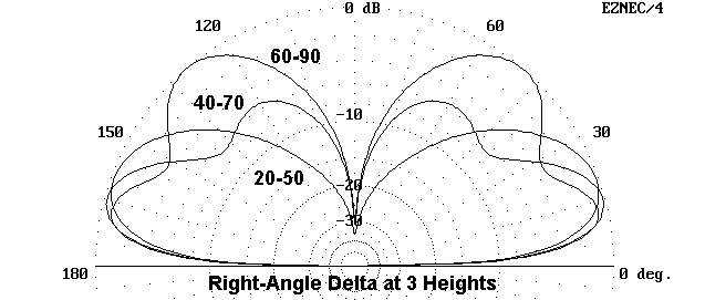 Figure 7 shows the elevation patterns for a 40-meter right angle delta at three heights: with the base at 20, 40, and 60 feet up. Figure 8 shows the same set of elevation patterns for a half square where the lowest heights of the free ends are 11, 31, and 51 feet. The lobe development is virtually indistinguishable between these two antennas (or between any other two of the SCVs).