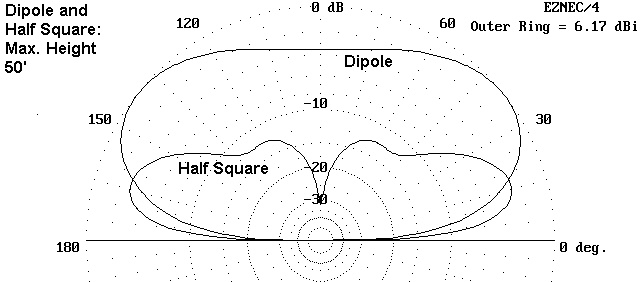Figure 9. Elevation patterns for a dipole and a half square antenna, both with maximum heights of 50 feet.