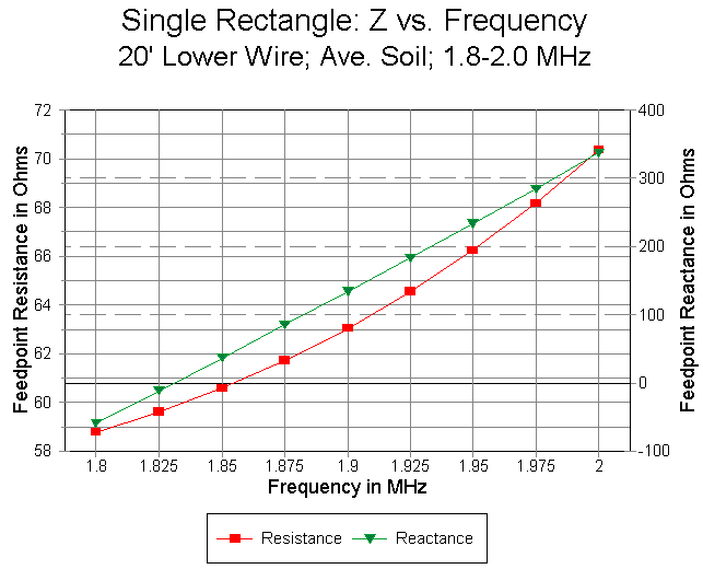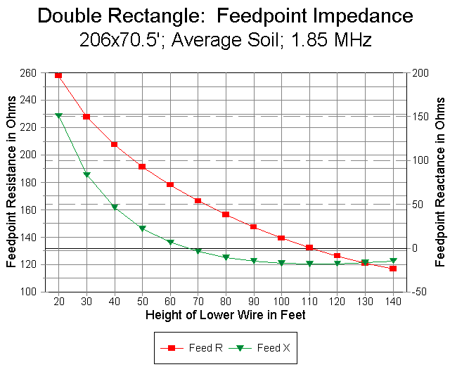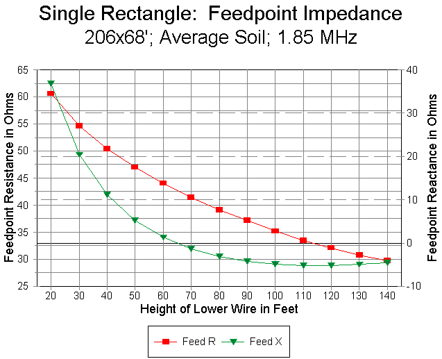 We can see the span of expected feedpoint impedances in Figure 6. At 140' up, the feedpoint impedance approaches that of free space models. The resistive component increases in a regular curve as the antenna is lowered to more usable heights, in accord with reductions in gain as the antenna passes the 90' level on its way down. Also notable as an earth-effect is the increase in inductive reactance with lower heights, a fact suggesting that builders of rectangles at low heights might wish to shrink them to bring them to resonance. (However, before adjusting the antenna size, see the notes on matching below.) Notice that the feedpoint resistance of the antenna at its target frequency (here, 1.85 MHz) is well within the range of direct coaxial cable feed.