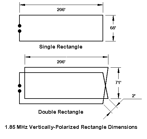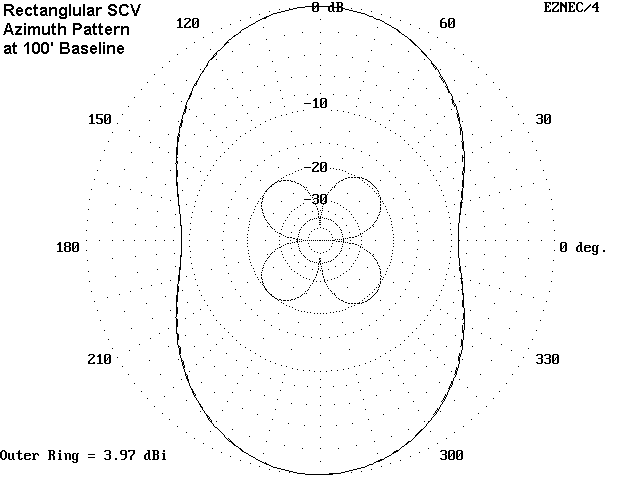 For 160 meters, where everything is big, the SCV with the smallest vertical and horizontal dimensions is the side-fed rectangle. Squares are much taller with less gain, while half squares are also taller with only a small margin of extra gain over the rectangle. Deltas are also taller, and longer corner-to-corner than the rectangle. Hence, for most installations requiring an SCV, the rectangle should be the antenna of choice.
