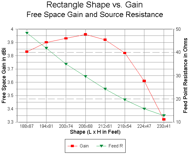 Maximum free space gain from the rectangle occurs when the long unfed sides are about 3 times longer than the short fed side and the loop is brought to resonance. This shows clearly in Figure 2, which tracks free space models (using #12 copper wire). This 3:1 figure is normally not very critical, as the gradual slope of the curve demonstrates. The resonant feedpoint resistance for the 206' long by 68' high version is just above 30 ohms, which is a bit low until we introduce proximity to the earth into the picture.