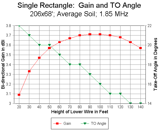 Figure 4 provides modeling data on the single rectangle for bottom wire heights ranging from 20' to 140' up. The antenna top wire will be 68' higher. The left axis records gain over average soil for the various heights. Note that as the bottom wire reaches the 90-100' mark, the gain levels off and then decreases with further increases in antenna height. The second curve referenced to the right axis records the continuous decrease in the elevation angle of maximum radiation, which runs from 23 degrees for the lowest height surveyed to 14 degrees for the highest.